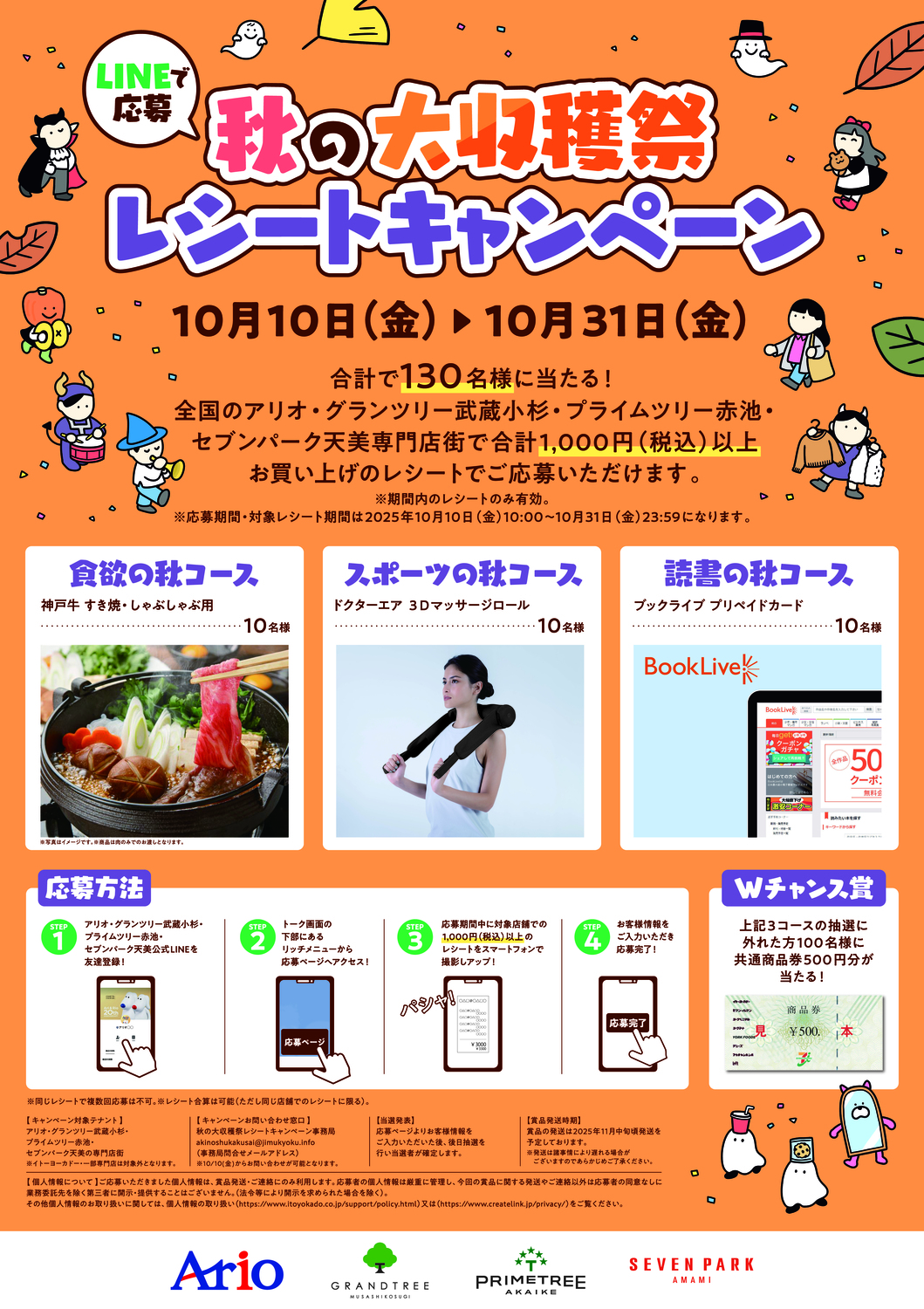 セブンパーク天美専門店街で合計1,000円(税込)以上お買い上げのレシートでご応募いただけます。