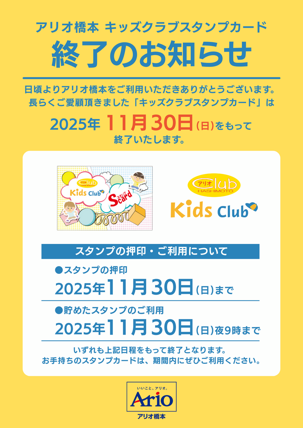 アリオ橋本 キッズクラブスタンプカード 終了のお知らせ