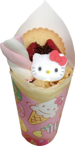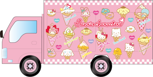 サンリオキャラクターのかわいい車で、サンリオキャラクタークレープ、ハローキティの焼きドーナツ、カフェワゴン限定雑貨を販売します♪