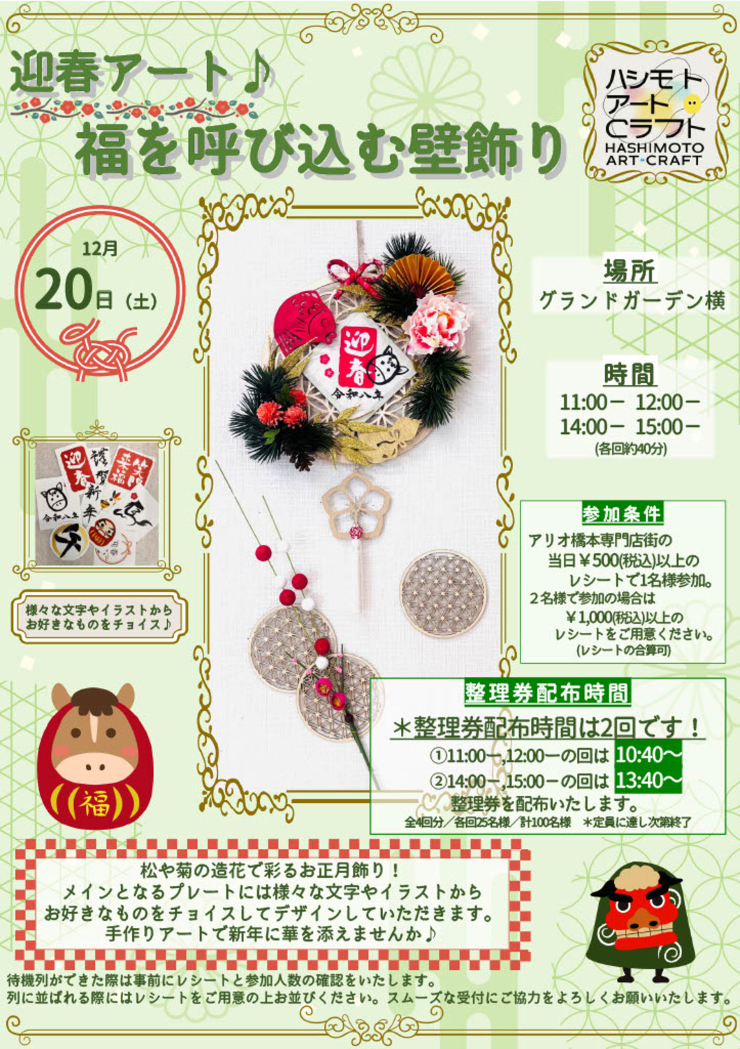 当日、アリオ橋本専門店街でのお買い上げレシート(税込500円以上)をご提示で、どなたでもご参加できます。