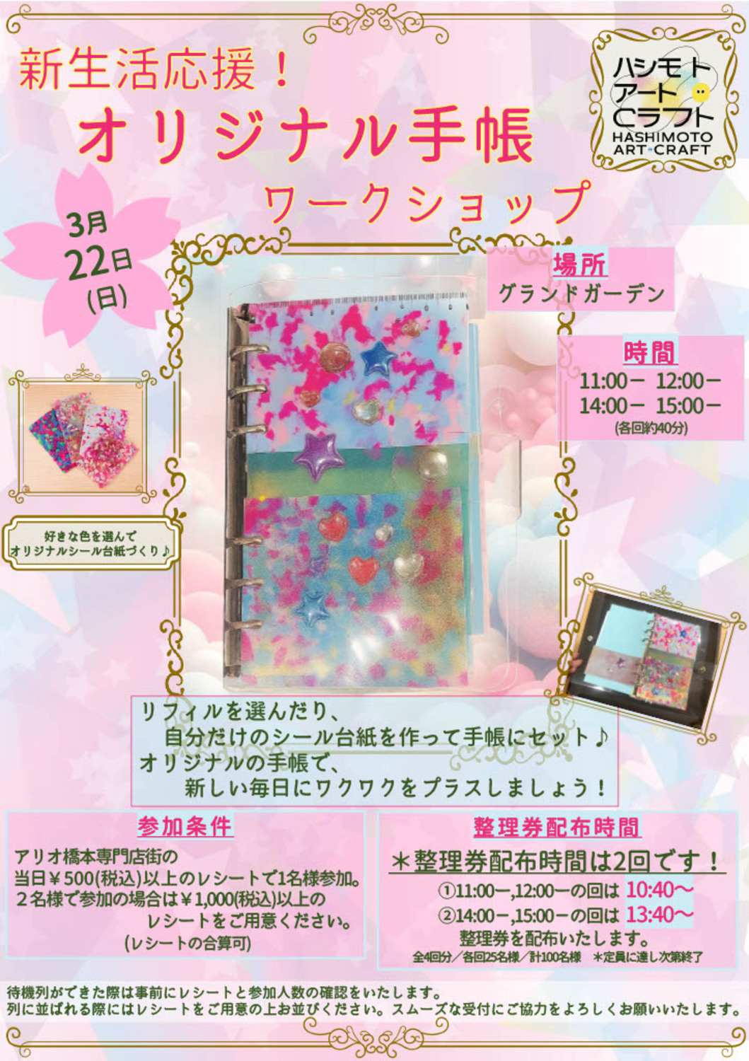 当日、アリオ橋本専門店街でのお買い上げレシート(税込500円以上)をご提示で、どなたでもご参加できます。