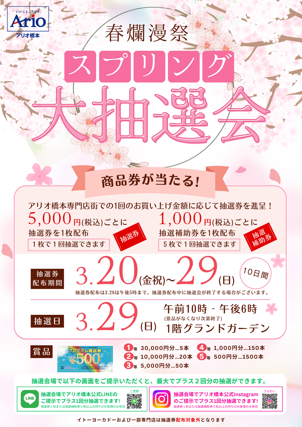 アリオ橋本アリオモール専門店街「スプリング大抽選会」を、3/29(日)に開催いたします。