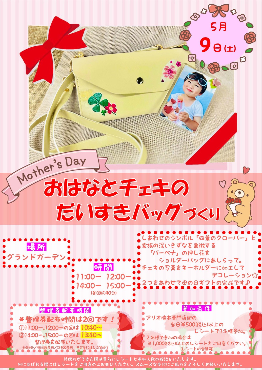 当日、アリオ橋本専門店街でのお買い上げレシート(税込500円以上)をご提示で、どなたでもご参加できます。