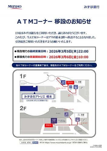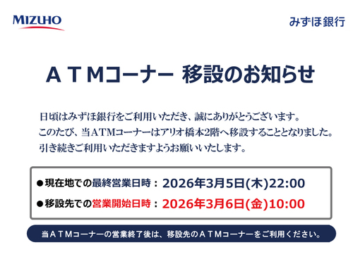 このたび、当ATMコーナーはアリオ橋本2階へ移設することとなりました。