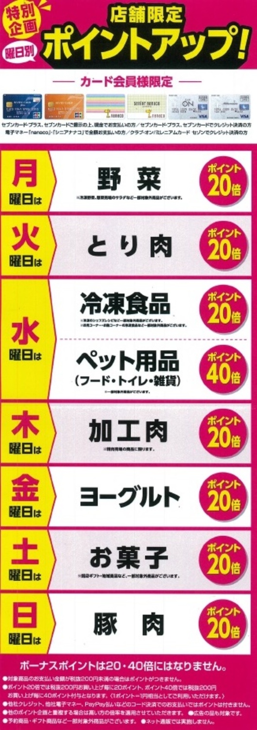 店舗限定特別企画曜日別ポイントアップ!