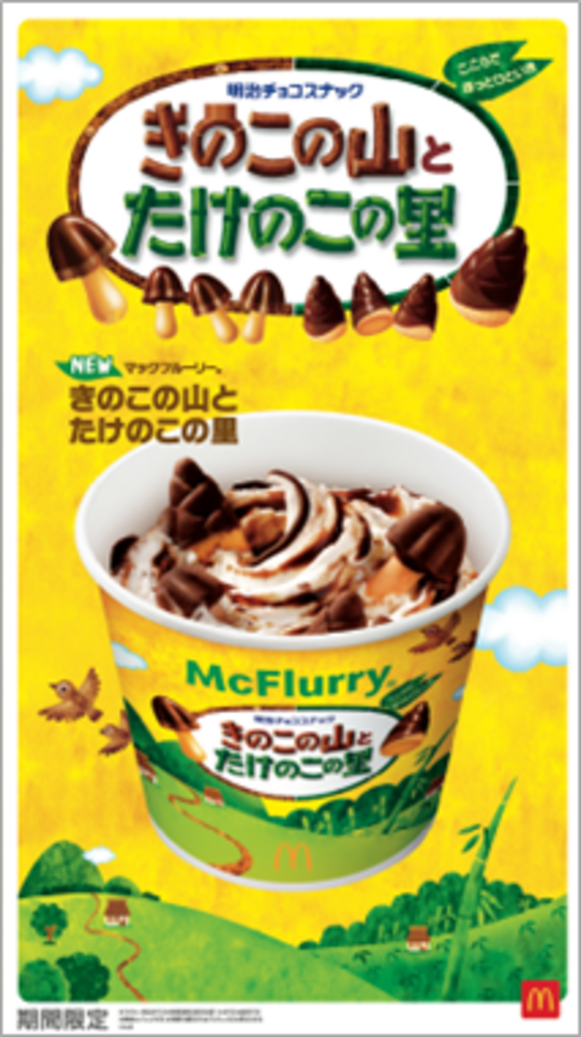 丸ごとそのまま入れた「きのこの山」と「たけのこの里」と、 口どけの異なる2種類のチョコソースを混ぜ込んだマックフルーリーⓇです。