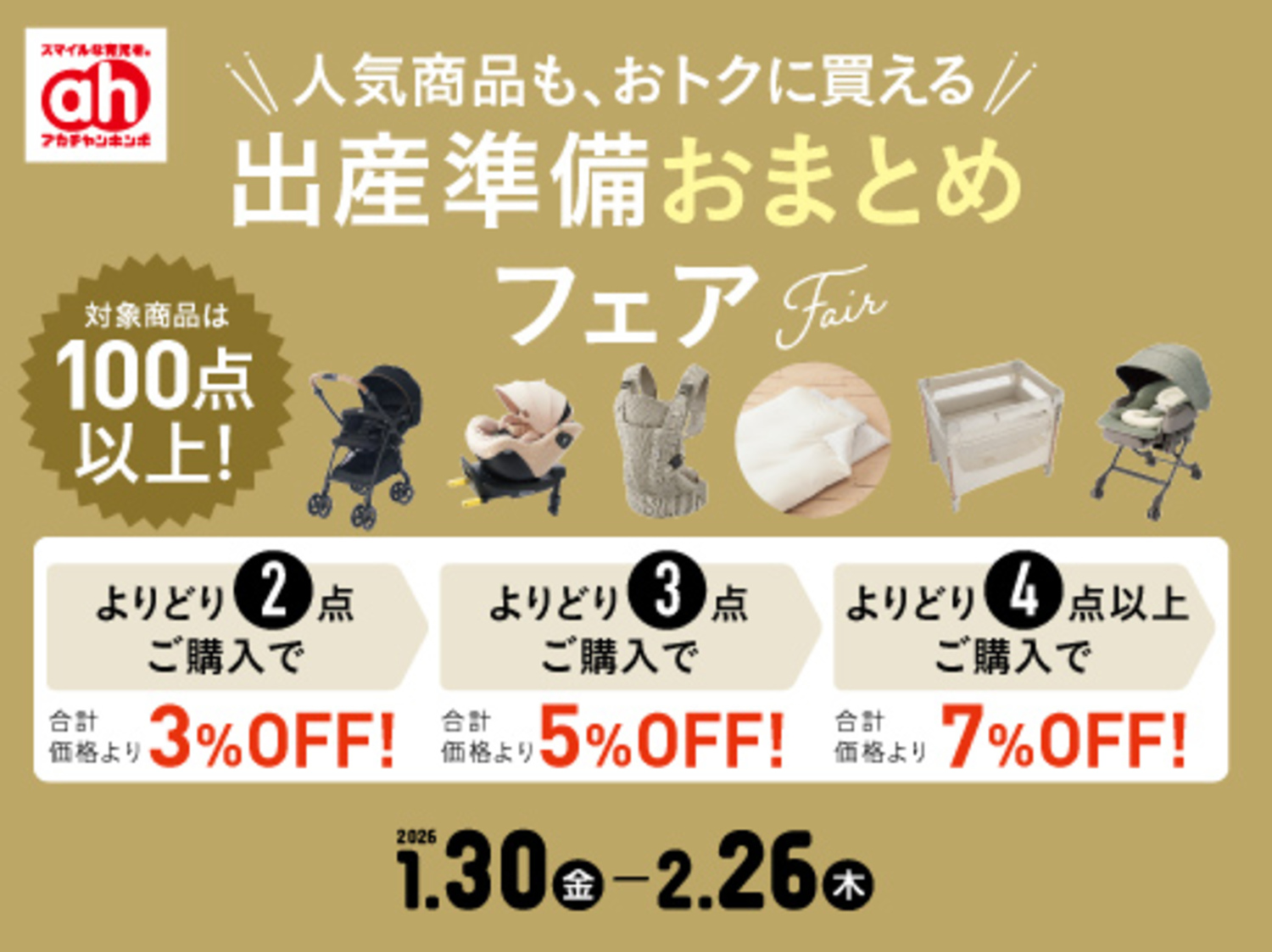 ベビーカー、チャイルドシート、抱っこ紐、ベビーラックなどの対象商品をよりどりでご購入いただくと、最大7%OFF◎