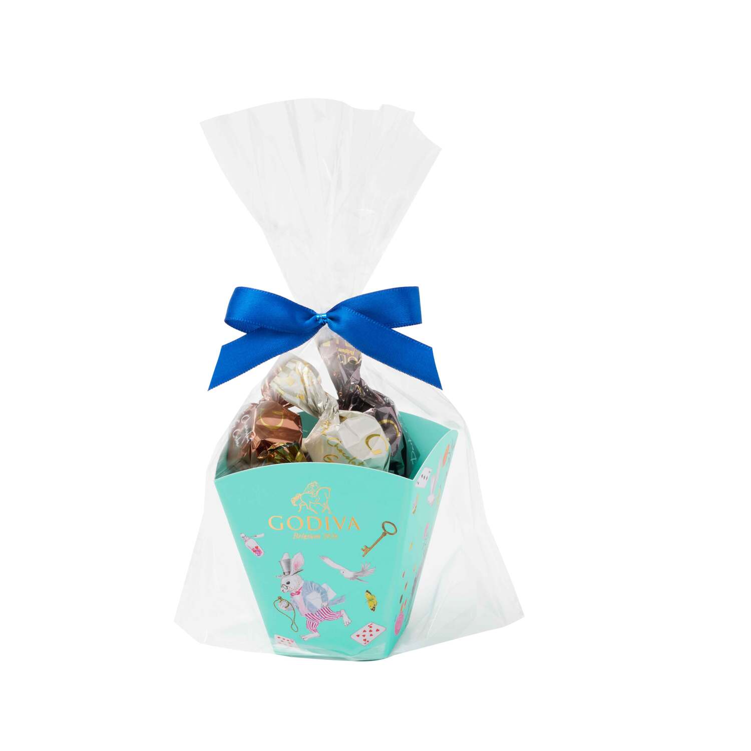 物語のシンボルのトランプやティーセットなどを描いた、小さなブーケのよう な可愛らしいパッケージに、ミルク、ダーク、2026年バレンタインより新登 場のダーク ストラッチャテッラのG キューブ チョコレートを詰め合わせました。