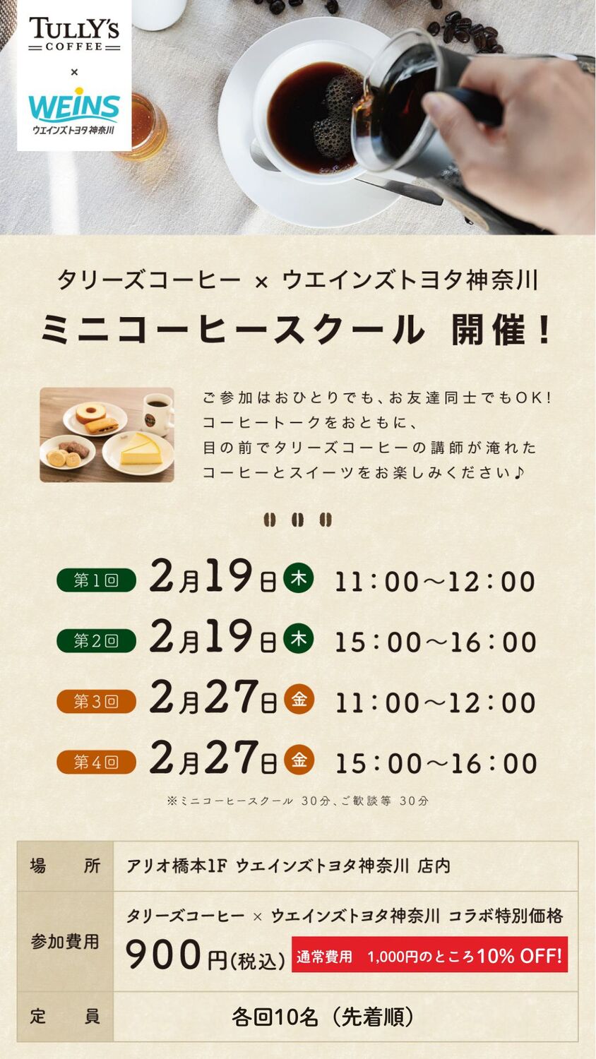 2月19日(木)、2月27日(金)の2日間限定で、タリーズコーヒー × ウエインズトヨタ神奈川のコラボ企画、『ミニコーヒースクール』を開催いたします。