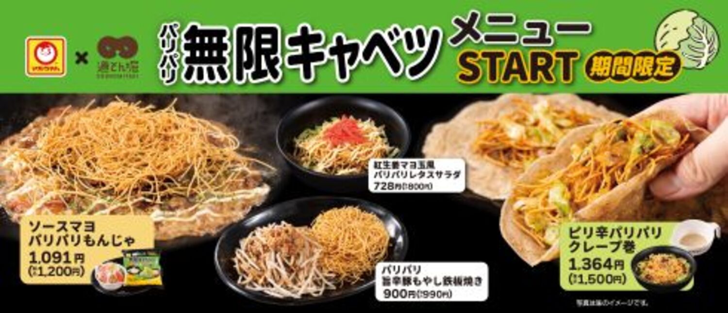 マルちゃん×道とん堀の特別コラボ企画として、**「パリパリ無限キャベツメニュー」**が期間限定でスタートしました。