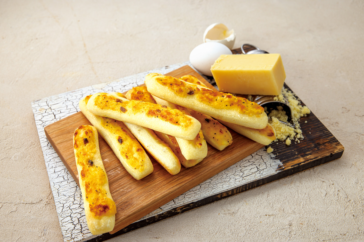 黒こしょうを効かせた濃厚なカルボナーラ風味の具をのせ、香ばしく焼き上げました。