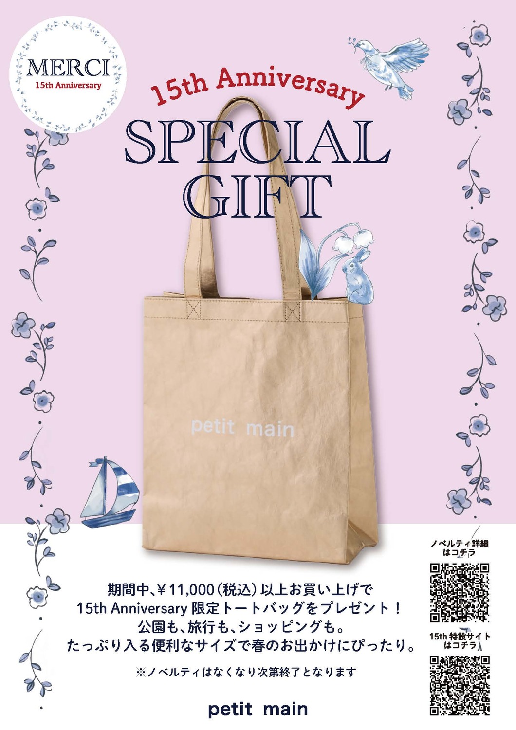 3/20(金)から¥11,000(税込)以上お買い上げのお客様に【15周年限定トートBAG】をプレゼントいたします!(なくなり次第終了)