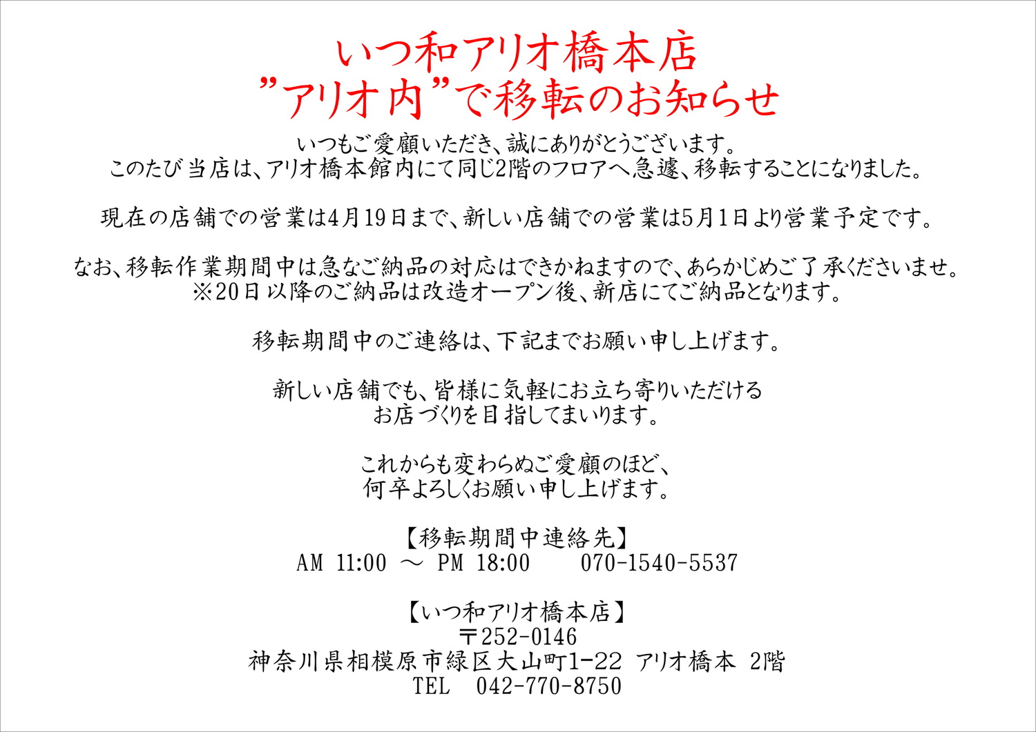 このたび当店は、アリオ橋本館内にて同じ2階のフロアへ急遽、移転することになりました。
